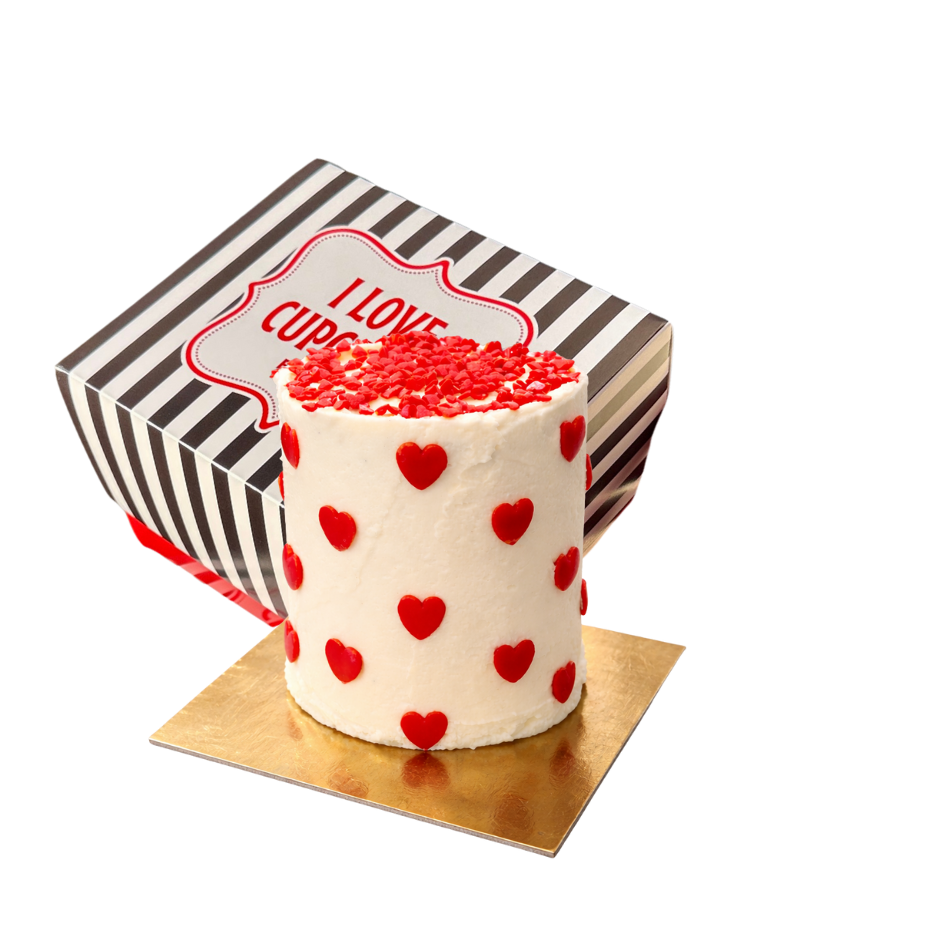 העוגה עשויה שכבות של עוגת וניל וקרם שוקולד לבן ומצופה במיקס סוכריות לב.